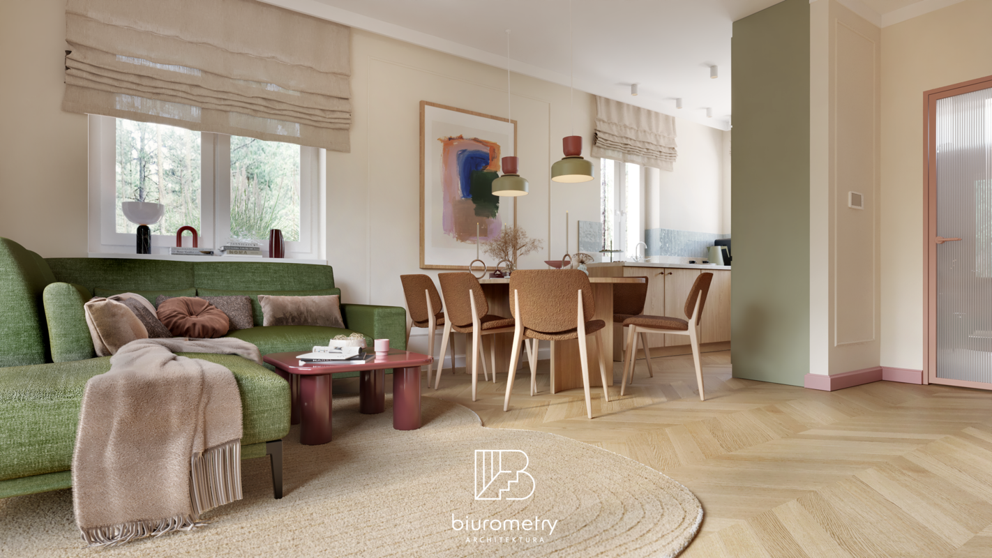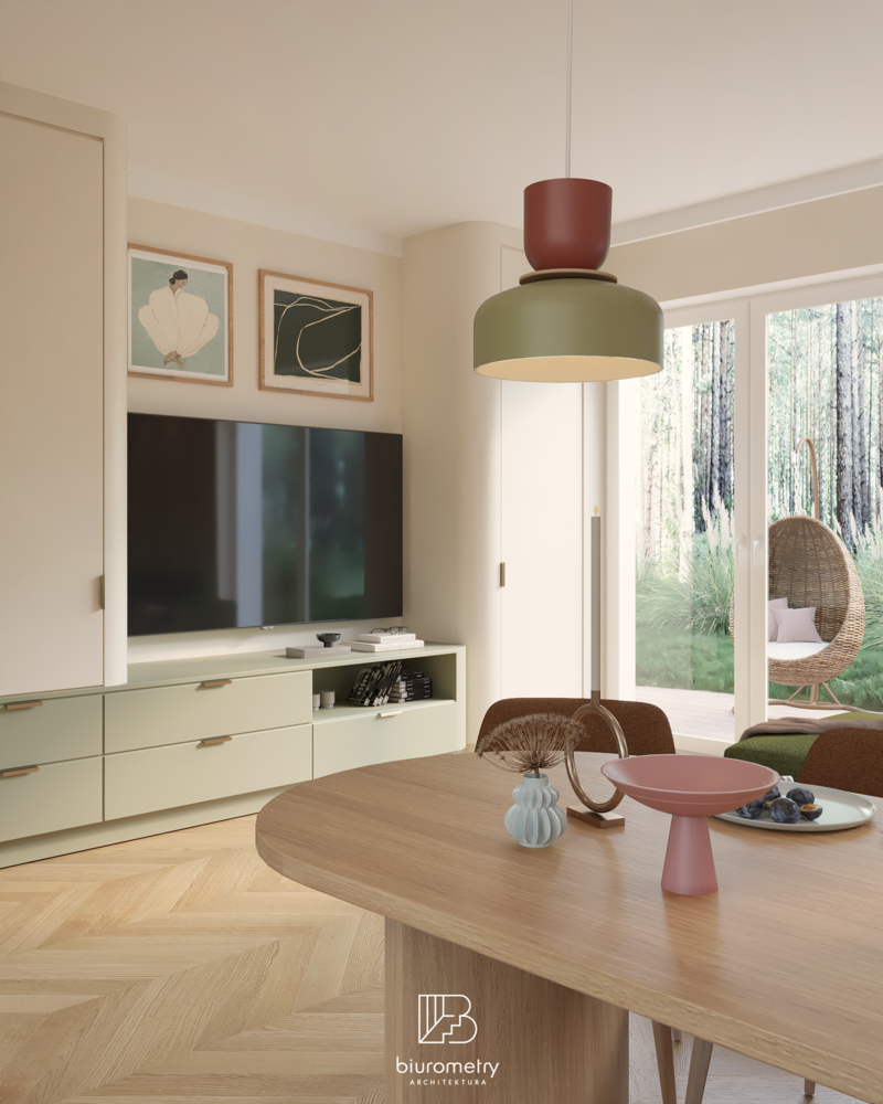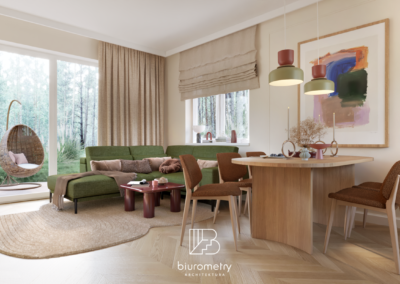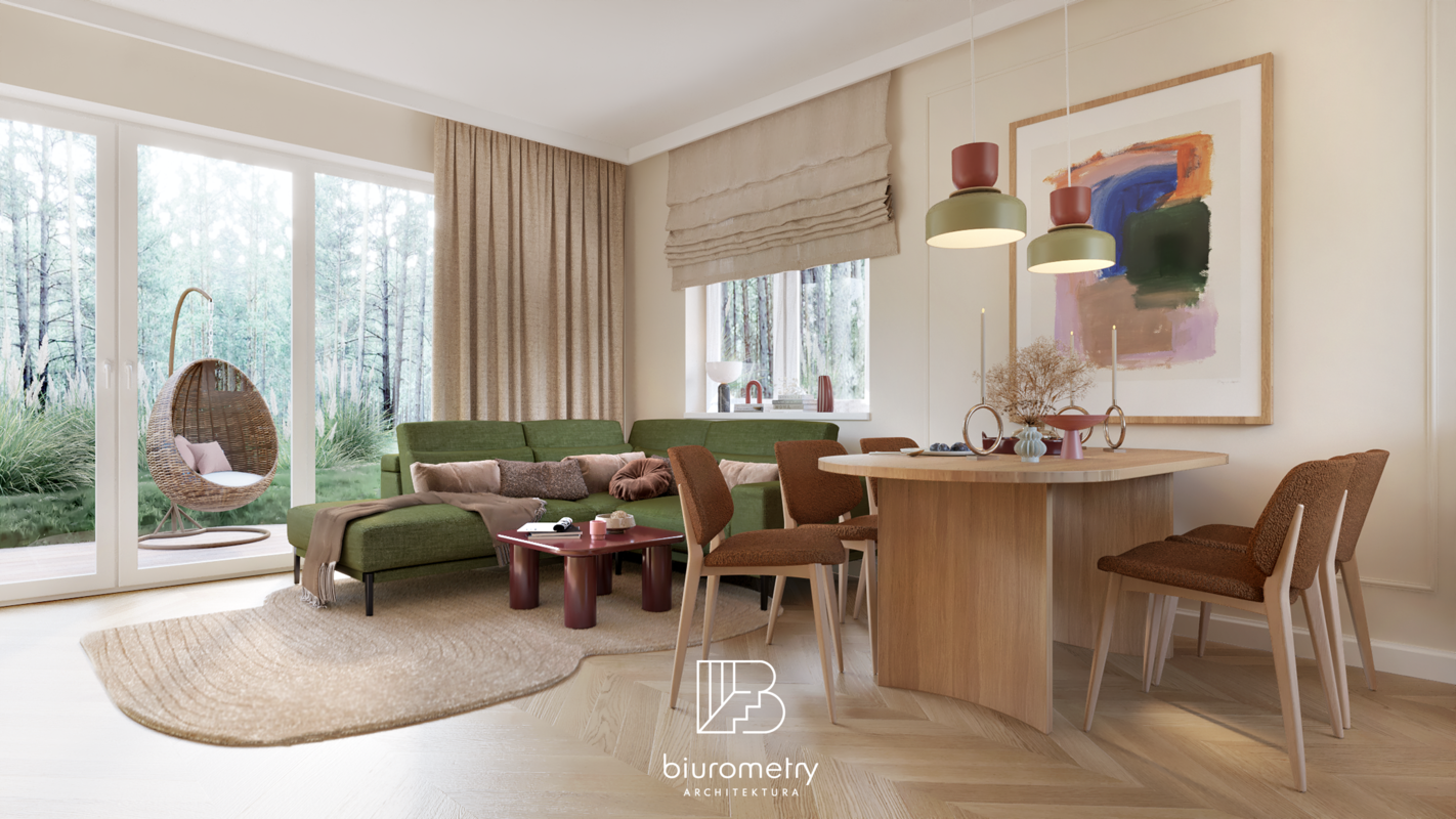 Równolegle z aspektami funkcjonalnymi bardzo istotna była warstwa estetyczna projektu. Klienci potrzebowali wsparcia w wypracowaniu spójnej, harmonijnej stylistyki, która będzie aktualna przez lata. Wnętrze opiera się na nowoczesnym modernizmie z wyraźnymi odniesieniami do mid century modern oraz subtelnie wprowadzonym kolorem. Miękkie formy mebli, naturalne materiały, stonowana paleta barw uzupełniona akcentami kolorystycznymi oraz dopracowane detale tworzą wnętrze przyjazne, ciepłe i ponadczasowe.