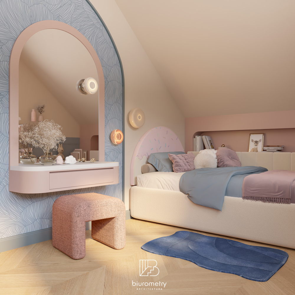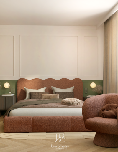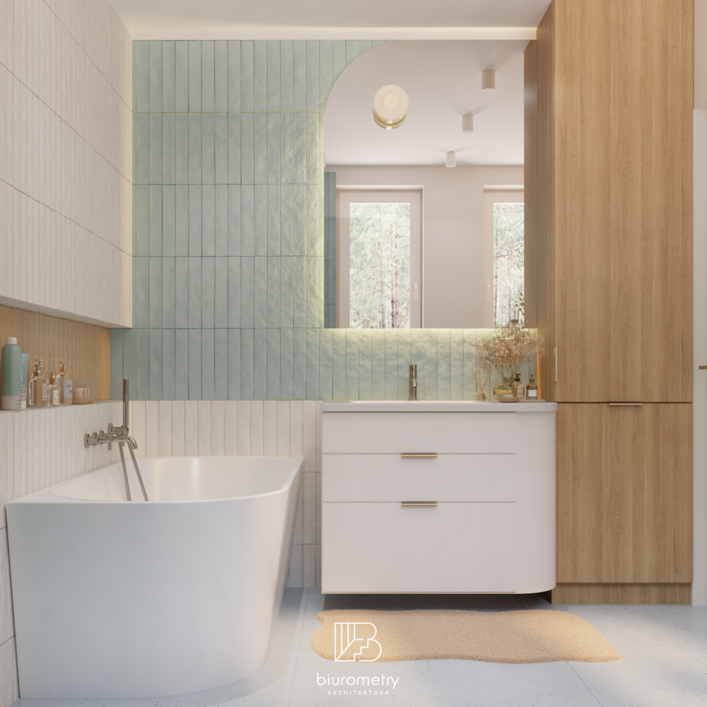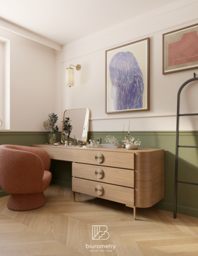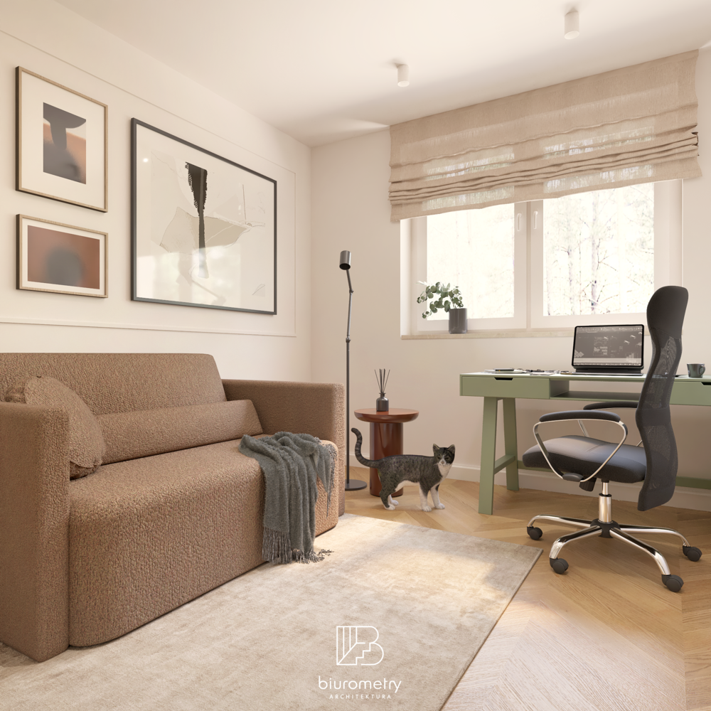 Równolegle z aspektami funkcjonalnymi bardzo istotna była warstwa estetyczna projektu. Klienci potrzebowali wsparcia w wypracowaniu spójnej, harmonijnej stylistyki, która będzie aktualna przez lata. Wnętrze opiera się na nowoczesnym modernizmie z wyraźnymi odniesieniami do mid century modern oraz subtelnie wprowadzonym kolorem. Miękkie formy mebli, naturalne materiały, stonowana paleta barw uzupełniona akcentami kolorystycznymi oraz dopracowane detale tworzą wnętrze przyjazne, ciepłe i ponadczasowe.