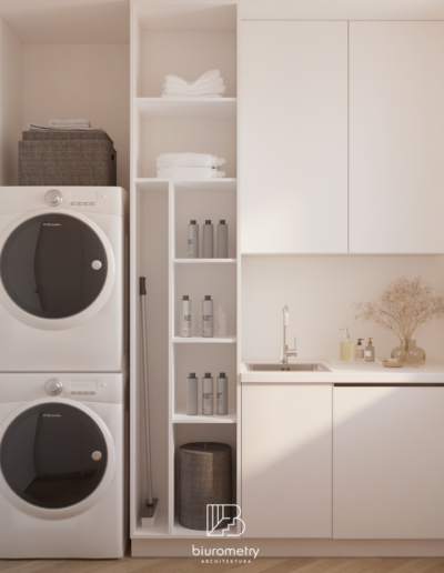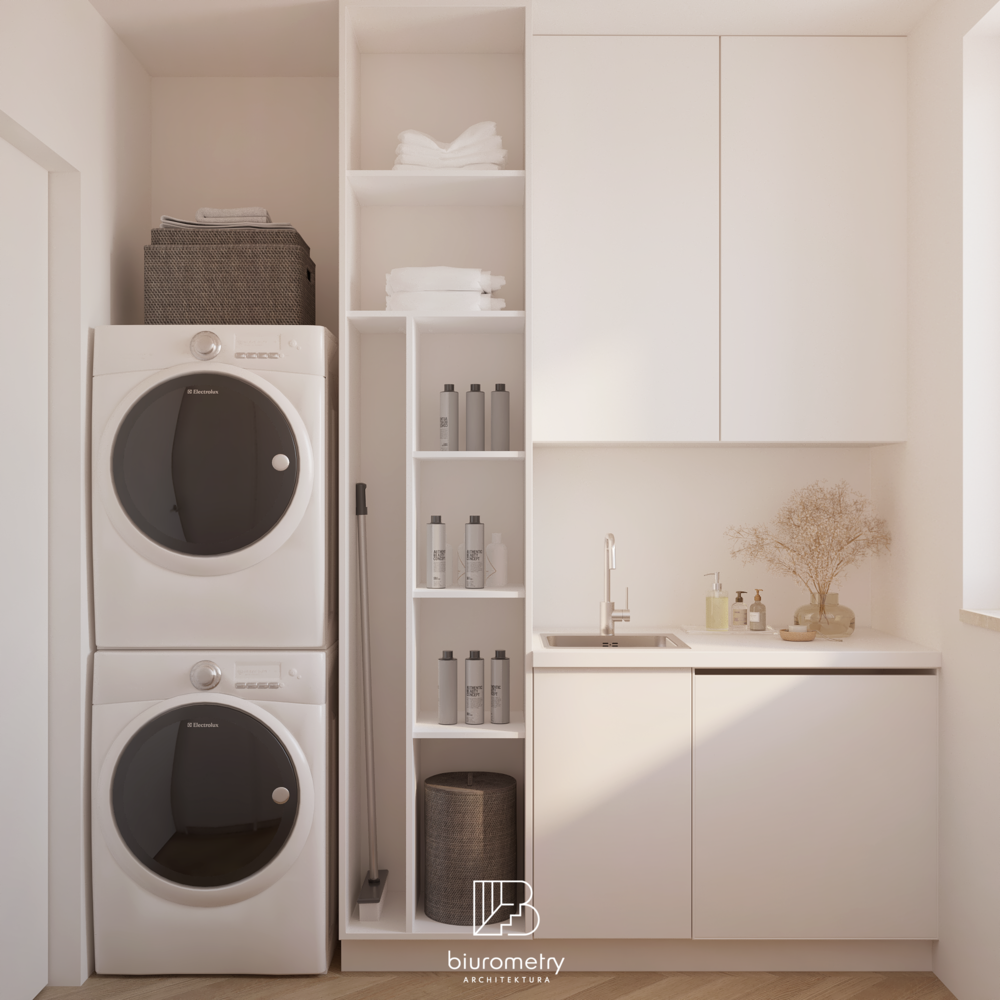 Jednym z kluczowych wyzwań projektowych była potrzeba wygospodarowania jak największej ilości miejsca do przechowywania. Klienci jasno określili, że zależy im na wnętrzu uporządkowanym, w którym każda rzecz ma swoje miejsce. W odpowiedzi na te potrzeby zaprojektowałam rozbudowany system zabudów stolarskich: głębokie szafy garderobiane, szafki na wino, książki i zastawę, a także miejsca na odzież sezonową. W korytarzu powstał ciąg szaf na całej długości, pod skosami w pokoju dziecięcym zaplanowano pojemne szuflady na zabawki, a w pralni funkcjonalne regały na chemię gospodarczą i zabudowy ułatwiające codzienne użytkowanie przestrzeni.