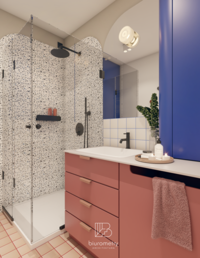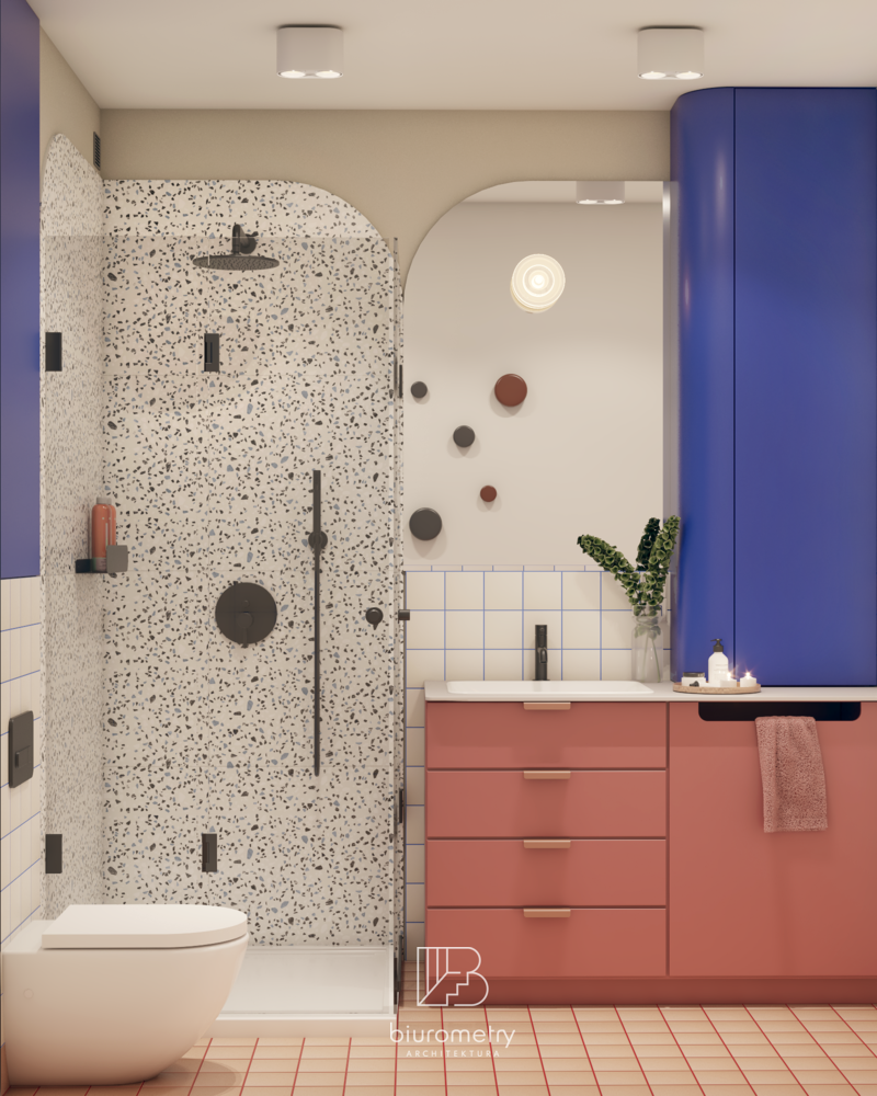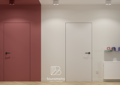 Z części stosunkowo dużej łazienki oraz fragmentu kuchni udało się wygospodarować pełnowartościową, intymną wnękę sypialnianą dla rodziców, wyraźnie oddzieloną od strefy dziennej. Co istotne – kuchnia nie straciła ani na ergonomii, ani na przestronności, a łazienka zachowała pełną funkcjonalność. Dodatkowym atutem stało się osobne, niewielkie pomieszczenie gospodarcze z pralką i suszarką, które znacząco uporządkowało codzienne funkcjonowanie mieszkania.
